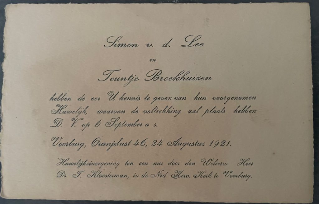 Simon van der Lee en zijn toekomstige vrouw Teuntje Broekhuizen wonen beide in Voorburg als ze voornemens zijn te trouwen. Op 24 augustus 1921 kondigen ze het voorgenomen huwelijk aan. De voltrekking van het huwelijk in de kerk staat gepland voor 6 september 1921. Het huwelijk in de Nederlandse Protestanten Kerk in Voorburg zal worden ingezegend door Ds T. (Taeke) Kloosterman.
