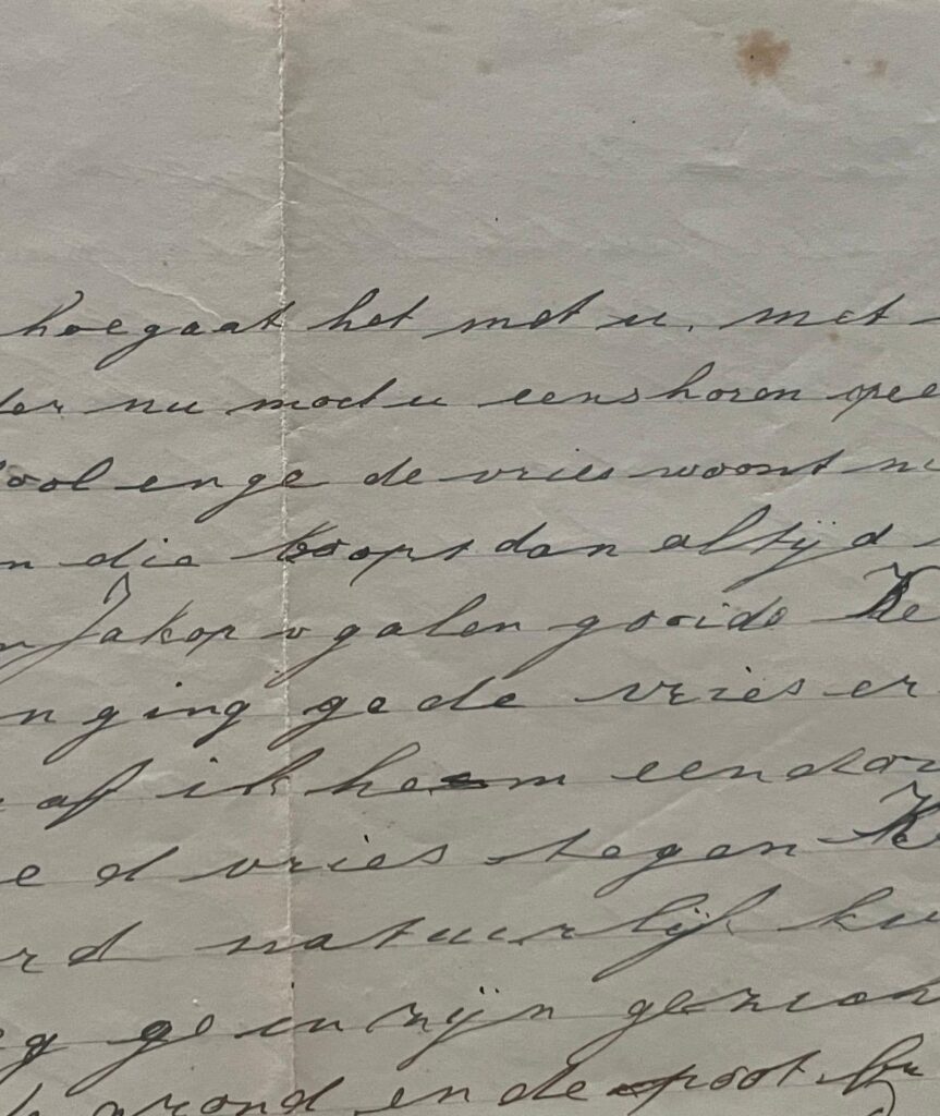 Moeder nu moet u eens horen, op een dag kwam ik uit school en Ge de Vries woont nu op het Wilhelminaplein [Bennebroek]. Die loopt dan altijd met ons mee. Kees Vink en Jakop v Galen gooide Kees v Putten op de grond. Toen ging Ge de Vries er vlak bij staan. Toen gaf ik hem een dauw, toen schopte Ge de Vries tegen Kees zijn hoofd. Kees werd natuurlijk kwaad. Hij stompte en sloeg Ge in zijn gezicht. Toen viel zijn bril op de grond en de poot brak.