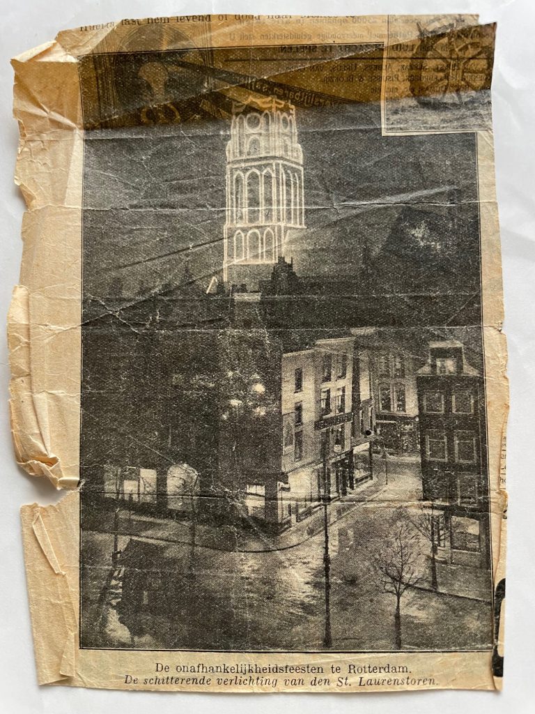 Tussen de archiefstukken vinden we een los krantenknipsel met daarop een foto van de St. Laurenstoren in Rotterdam met op de voorgrond huizen met avondverlichting in de Wijde Marktstraat. Onder de foto staat de tekst “De onafhankelijkheidsfeesten te Rotterdam. De schitterende verlichting van de st. Laurenstoren.“