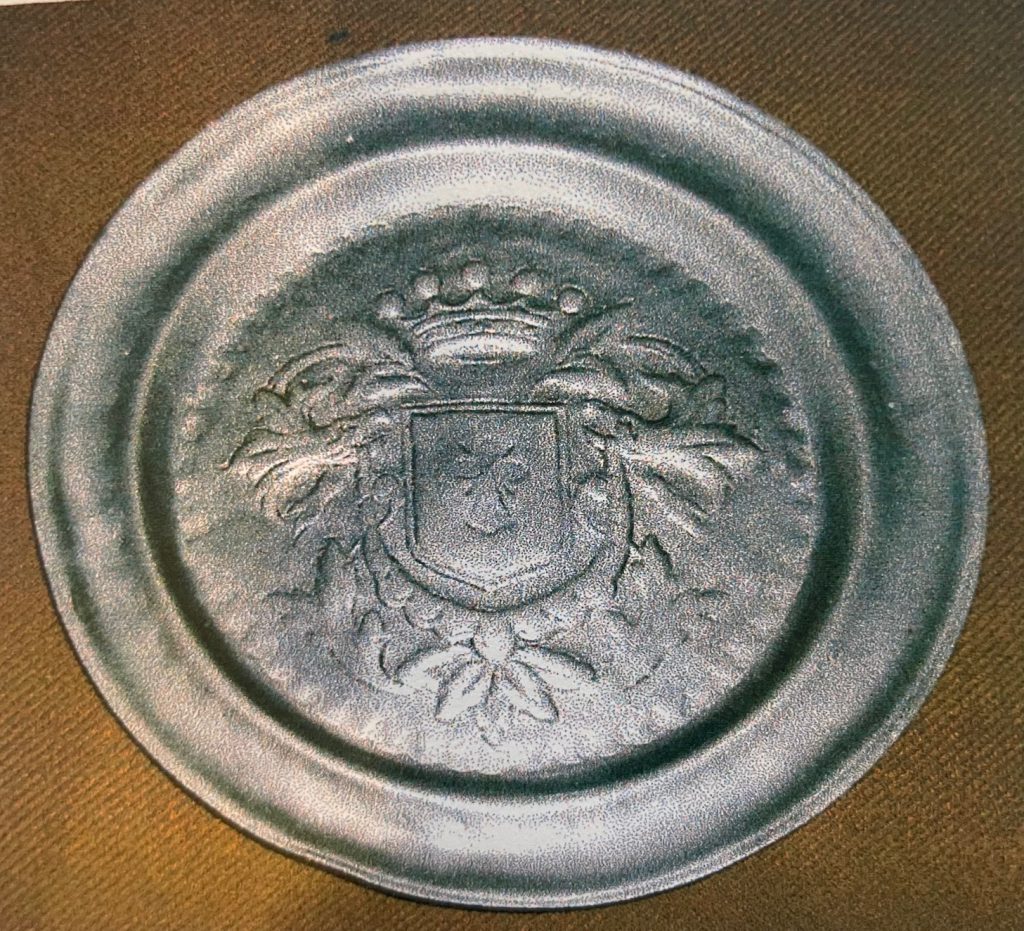 Op het tinnen bord staat het familiewapen van de familie Willink. Hoewel de familie Willink niet van adel is, hadden zij vanouds een familiewapen. Het wapen van de familie Willink bestaat uit een gouden eikentak met drie eikels op een blauw schild.