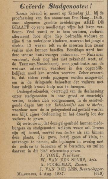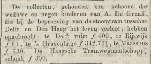 Er werd gecollecteerd in en buiten Maassluis, wat samen goed was voor f1403,73. Daarnaast ontving de weduwe een gift van f300 van de Haagsche Tramwegmaatschappij. Ook andere particulieren droegen bij.