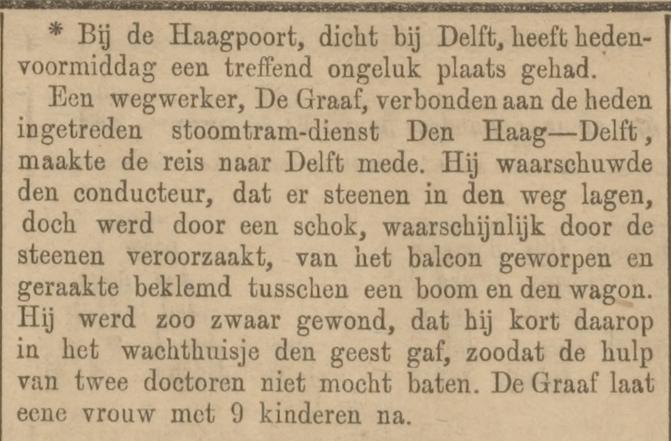In 1887 vond de allereerste testrit plaats op het nieuwe spoor van Den Haag naar Delft. Bij deze historische gebeurtenis was Arie de Graaff, 43 jaar, aanwezig. Helaas kwam Arie bij een tragisch ongeval tijdens deze rit om het leven.
