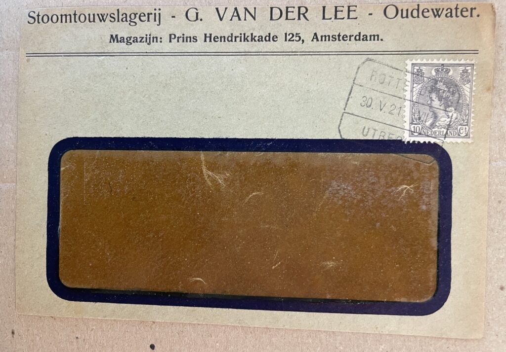 De voorkant van deze bedrijfsenvelop uit 1921 is van de Stoomtouwslagerij G. van der Lee in Oudewater, met een magazijn aan de Prins Hendrikkade 125 in Amsterdam.