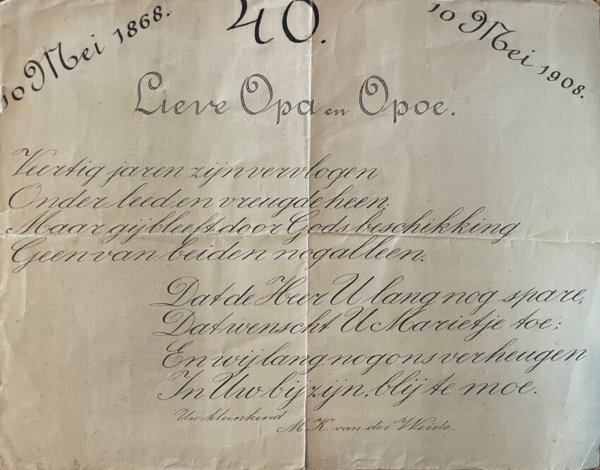 Op 10 mei 1908 vierden de grootouders van Maria Klazina van der Weide hun 40-jarig huwelijksjubileum. Maria Klazina was toen ongeveer drie jaar oud en zal zelf waarschijnlijk geen herinneringen hebben aan deze feestelijke dag. Haar vader, Klaas van der Weide, heeft naar verwachting wél een blijvende herinnering willen creëren van deze bijzondere gelegenheid –…