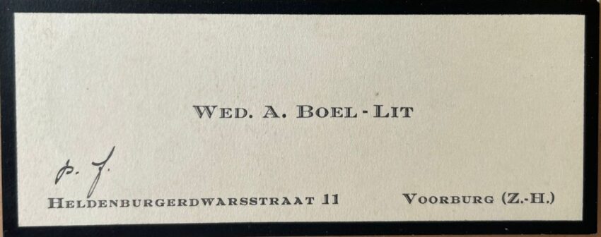 Het is een klein rouwkaartje van 10 cm bij 4 cm. Op de kaart staat nauwelijks tekst. Toch is het bewaard gebleven omdat iemand dat belangrijk vond. De voorkant van het rouwkaart geeft niet meer prijs dan dat het gaat om weduwe A. Boel-Lit. Met als adres Heldenburgerdwarsstraat 11 Voorburg (Z.H.) Met de had geschreven…