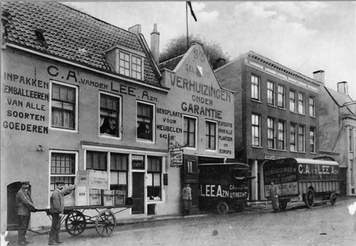 Gezicht op de voorgevel van het kantoor van de expediteur C.A. van der Lee Azn. (Lange Nieuwstraat 93-95) te Utrecht, uit het zuidoosten; op de voorgrond, tweede van links, de heer C.A. van der Lee met personeel en enkele verhuiswagens.
